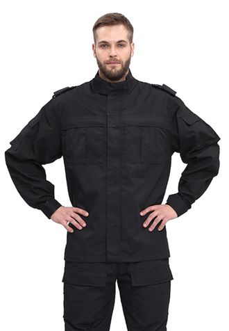 Куртка прямого силуэта удлиненная, фасон предполагает возможность заправить куртку в брюки. Центральная застежка на молнию с планкой на липучках; два нагрудных объемных накладных кармана со складками на молнию под отлетным краем кокетки; погоны на пуговице; спинка со складками до линии талии для свободы движения; рукава на манжете с патой на широкой липучке; накладные объемные карманы на рукавах с клапаном на липучке; усилительные накладки в области локтя; воротник стойка с патой на липучке; внутренний навесной карман на липучке.